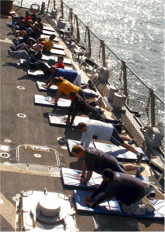 | 188k | 080614-N-5283B-022. Baltic Sea, June 14 2008, sailors participate in command physical training on the flight deck of the guided-missile destroyer USS Cole (DDG 67). Cole is on a scheduled deployment supporting Baltic Operations (BALTOPS), an annual international exercise involving 13 countries. U.S. Navy photo by Mass Communication Specialist Seaman Kristin M. Baker. | Robert M. Cieri |