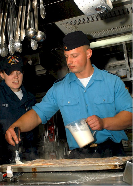 | 127k | 080612-N-5283B-016. Baltic Sea, June 12 2008, Culinary Specialist Seaman Mindy Best watches Culinary Specialist 3rd Class Andree Bode, of the German frigate FGS Bayern (F 217), ice a sugar cake in the galley of the guided-missile destroyer USS Cole (DDG 67). Cole is on a scheduled deployment supporting Baltic Operations (BALTOPS), an annual international exercise involving 13 countries. U.S. Navy photo by Mass Communication Specialist Seaman Kristin M. Baker. | Bill Gonyo |