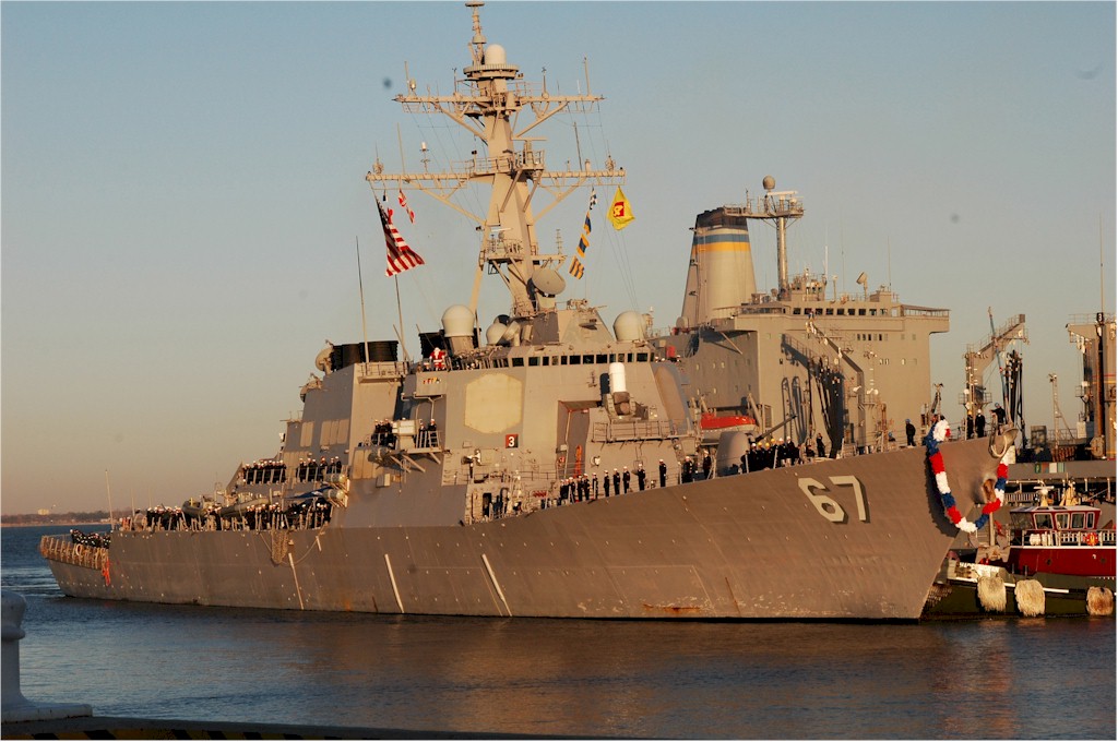 | 133k | 100208-N-3154P-001. Norfolk, February 8 2010, the Arleigh Burke-class guided-missile destroyer USS Cole (DDG 67) is pierside at Naval Station Norfolk before departing on a scheduled seven-month deployment. Cole will operate in the Mediterranean Sea and the Persian Gulf during her deployment conducting maritime security operations. U.S. Navy photo by Mass Communication Specialist Seaman Scott Pittman. | Robert M. Cieri |
