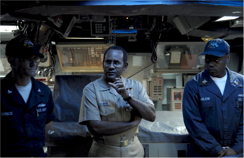 | 155k | 080815-N-1713L-095 Norfolk, Va., August 15 2008, Commander, U.S. Second Fleet Vice Adm. Mel Williams Jr. speaks with Operations Specialist 2nd Class (SW) Gary Spence and Operations Specialist 1st Class (SW) Tyrone Barlow in the Combat Information Center onboard USS Cole (DDG 67). Vice Adm. Williams visited the ship during his first waterfront tour of Second Fleet assets since assuming command Aug. 8. U.S. Navy Photo by Mass Communication Specialist 1st Class Lolita Lewis. | Bill Gonyo |