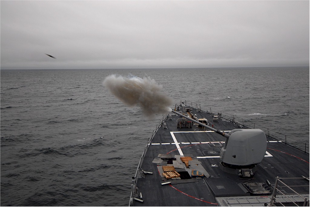 | 144k | 091013-N-1688B-011. Atlantic Ocean, October 13 2009, a 5-inch/54-caliber (Mk 45) lightweight gun is fired aboard the guided-missile destroyer USS Cole (DDG 67) during a live fire exercise. Cole is participating in Exercise Joint Warrior 09-2, a United Kingdom-led, multinational exercise designed to improve interoperability between allied navies as well as to prepare for a role in combined operations during upcoming deployments. U.S. Navy photo by Mass Communication Specialist 3rd Class Matthew Bookwalter. | Robert M. Cieri |