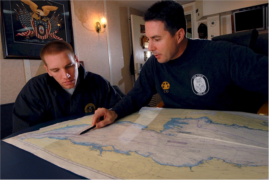 | 179k | 091028-N-1688B-134. Atlantic Ocean, October 28 2009, Ensign Francis Dore, the navigator aboard the guided-missile destroyer USS Cole (DDG 67), reviews navigational charts with commanding officer Cmdr. Edward Devinney. Cole recently completed Exercise Joint Warrior 09-2 and is continuing routine operations in the U.S. 6th Fleet area of responsibility. U.S. Navy photo by Mass Communication Specialist 3rd Class Matthew Bookwalter. | Bill Gonyo |