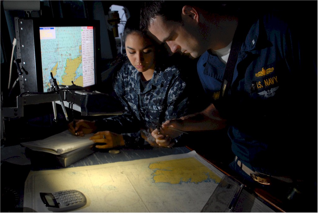 | 131k | U.S. Navy Lt. j.g. Justin Short checks over navigational charts with Seaman Apprentice Stephane Razoarreola on the bridge of the guided-missile destroyer USS Cole (DDG 67) on Oct. 14, 2009. The Cole is participating in Exercise Joint Warrior 09-2, a United Kingdom-led, multinational and multi-warfare exercise designed to improve interoperability between allied navies as well as to prepare for a role in combined operations during upcoming deployments. DoD photo by Petty Officer 3rd Class Matthew Bookwalter, U.S. Navy. | Bill Gonyo |