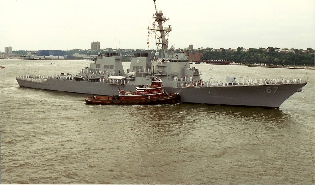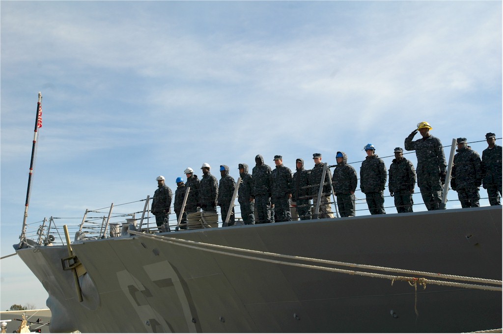 | 119k | 100208-N-3154P-003. Norfolk, February 8 2010, sailors man the rails aboard the Arleigh Burke-class guided-missile destroyer USS Cole (DDG 67), before they depart Naval Station Norfolk for a scheduled seven-month deployment. Cole will operate in the Mediterranean Sea and the Persian Gulf during her deployment conducting maritime security operations. U.S. Navy photo by Mass Communication Specialist Seaman Scott Pittman. | Robert M. Cieri |