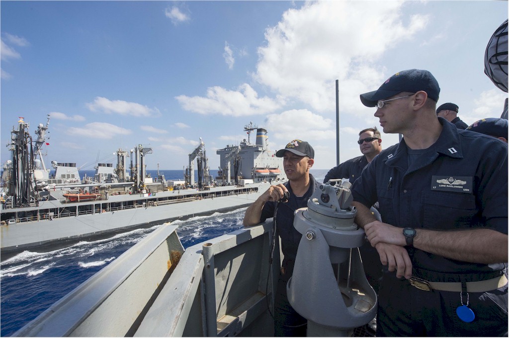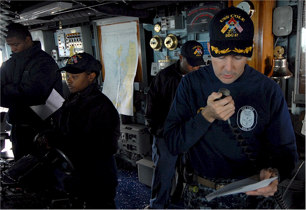 | 153k | 141031-N-IY142-211. Mediteranean Sea, October 31 2014, Lt. Cmdr. Robert Kallman orders a course change while conning the Arleigh Burke-class guided-missile destroyer USS Cole (DDG 67) alongside the Military Sealift Command fleet replenishment oiler USNS Leroy Grumman (T-AO 195) for a replenishment at sea. Cole is conducting naval operations in the U.S. 6th Fleet area of responsibility in support of U.S. national security interests in Europe. U.S. Navy photo by Mass Communication Specialist 2nd Class John Herman. | Ron Reeves |