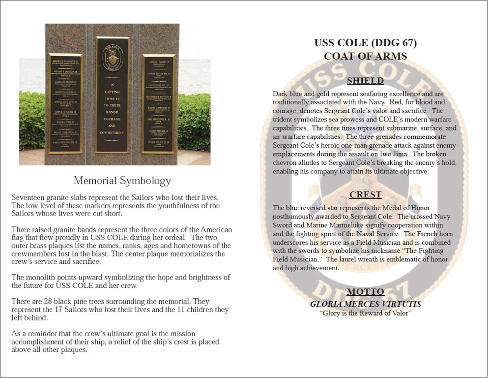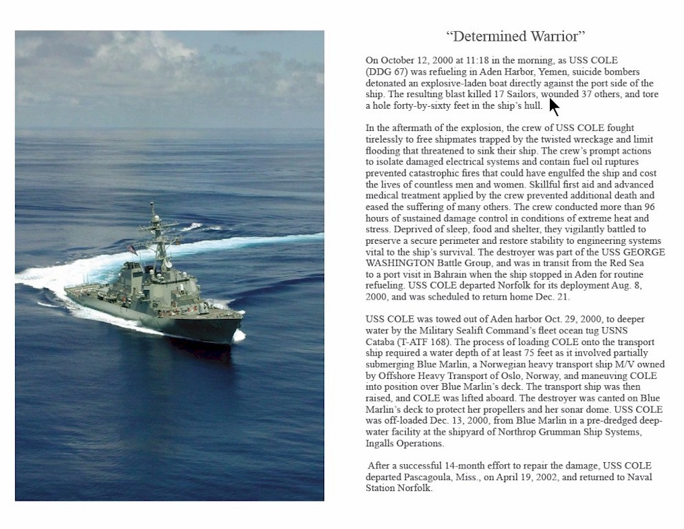 | 178k | A series of 7 images of the Memorials to the lost members of the Cole's Crew and SGT Cole including the on the Messdecks, The COLE memorial, The Hall of Heros and a sketch by Peter Hsu. | Aileen P. Mattson, ASWO, DDG-67 |