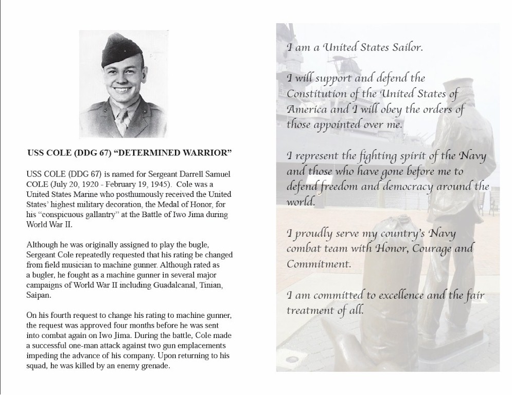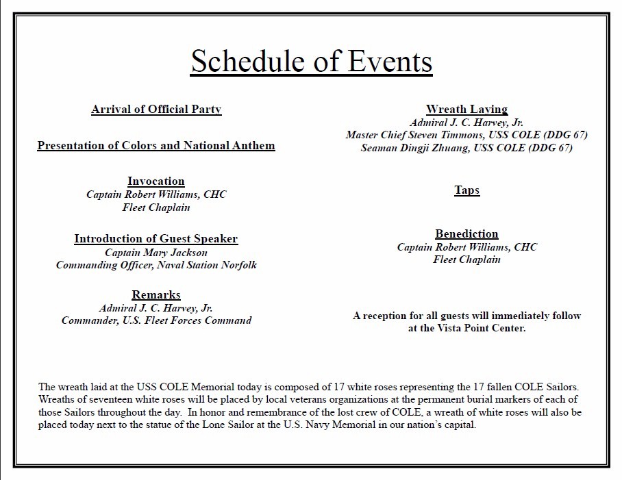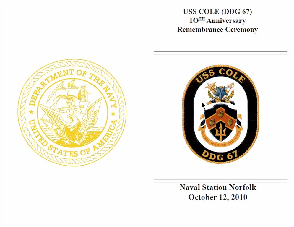 | 113k | The 10th Anniversary Remembrance Ceremony Program on October 12 2010. | Aileen P. Mattson, ASWO, DDG67 |