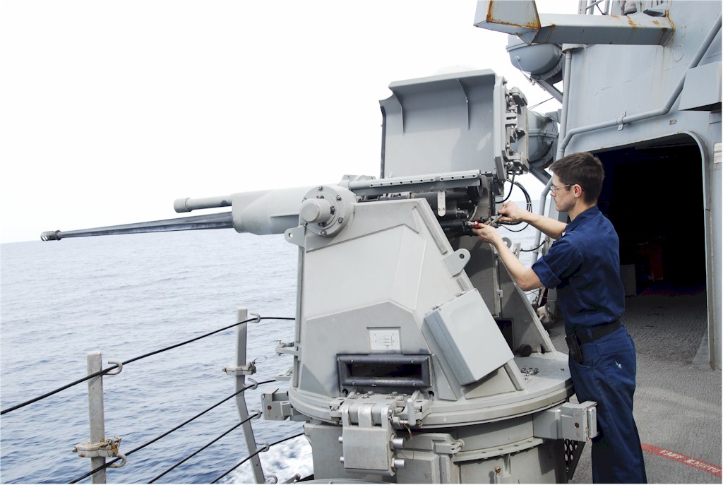 | 140k | 140223-N-YI411-021. Atlantic Ocean, February 23 2014, Gunner's Mate 1st Class Donald Rakes does last minute checks on a 25mm gun before a live fire exercise aboard the Arleigh Burke-class guided missile destroyer USS Cole (DDG-67). Cole is underway on an independent deployment certification exercise. U.S. Navy photo by Lt. j.g. Christopher E. Kaps. | Robert M. Cieri |