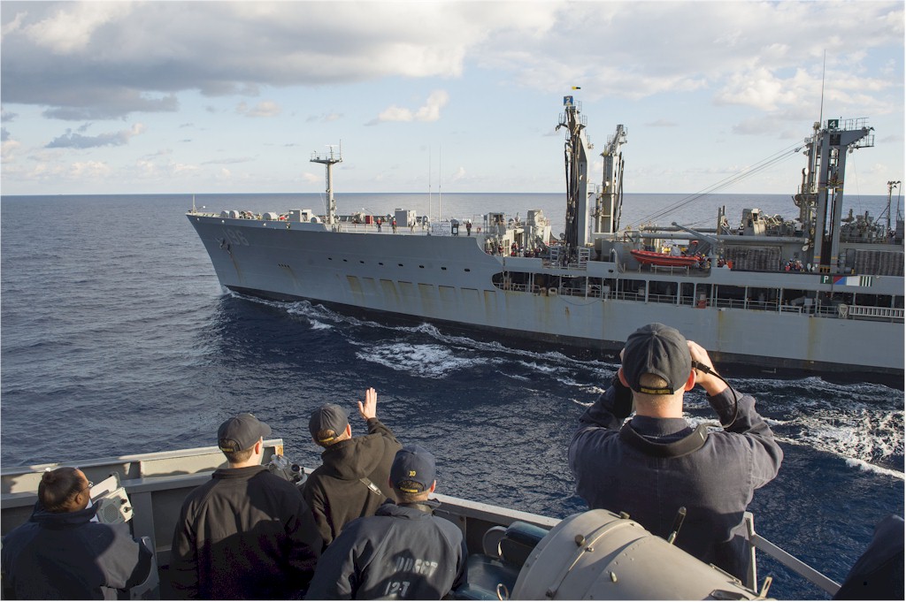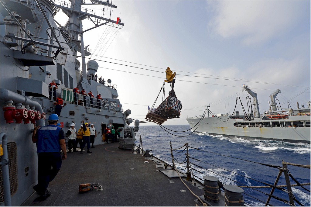 | 177k | 141221-N-IY142-024. Mediterranean Sea, December 21 2014, sailors aboard the guided-missile destroyer USS Cole (DDG 67) maneuver the ship into position to fire lines across during a replenishment-at-sea with the Military Sealift Command fleet replenishment oiler USNS Kanawha (TAO 196). Cole and Kanawh are conducting naval operations in the U.S. 6th Fleet area of responsibility in support of U.S. national security interests in Europe. U.S. Navy photo by Mass Communication Specialist 2nd Class John Herman. | Ron Reeves |