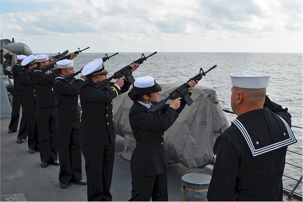 | 159k | 141011-N-IY142-045. Black Sea, October 11 2014, sailors aboard the Arleigh Burke-class guided-missile destroyer USS Cole (DDG 67) fire a rifle volley during a memorial ceremony to honor victims of the Oct. 12, 2000 terrorist attack on the ship. Cole is conducting naval operations in the U.S. 6th Fleet area of responsibility in support of U.S. national security interests in Europe. (U.S. Navy photo by Religious Programs Specialist 1st Class Darrell Howell. | Ron Reeves |