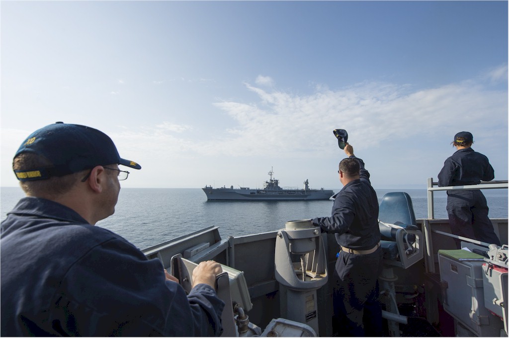 | 110k | 141013-N-IY142-029. Black Sea, October 13 2014, Cmdr. Dennis Farrell, commanding officer of the Arleigh Burke-class guided-missile destroyer USS Cole (DDG 67), waves to the U.S. 6th Fleet command and control ship USS Mount Whitney (LCC 20) during small boat operations. Cole and Mount Whitney are conducting naval operations in the U.S. 6th Fleet area of responsibility in support of U.S. national security interests in Europe. U.S. Navy photo by Mass Communications Specialist 2nd Class John Herman. | Ron Reeves |