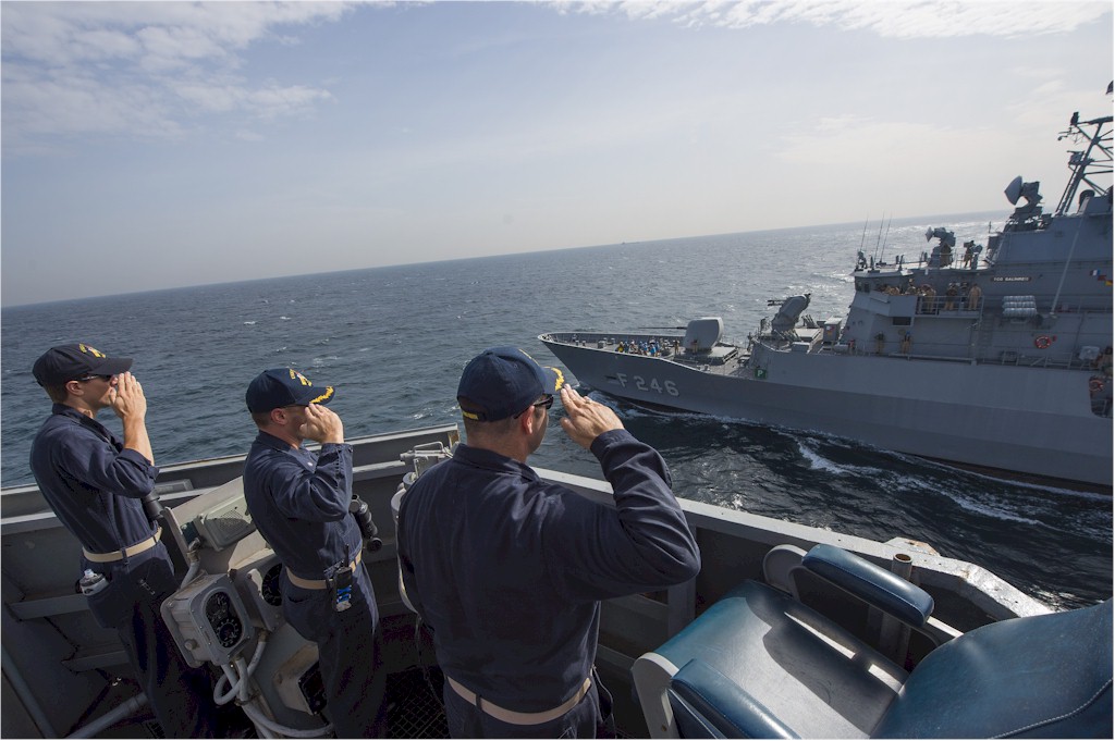 | 114k | 141016-N-IY142-089. Black Sea, October 16 2014, Cmdr. Dennis Farrell, commanding officer of the Arleigh Burke-class guided-missile destroyer USS Cole (DDG 67), salutes the crew of the Turkish navy Barbaros-class frigate TCG Salihreis (F 246) during a passing exercise. Cole is conducting naval operations in the U.S. 6th Fleet area of responsibility in support of U.S. national security interests in Europe. U.S. Navy photo by Mass Communications Specialist 2nd Class John Herman. | Ron Reeves |