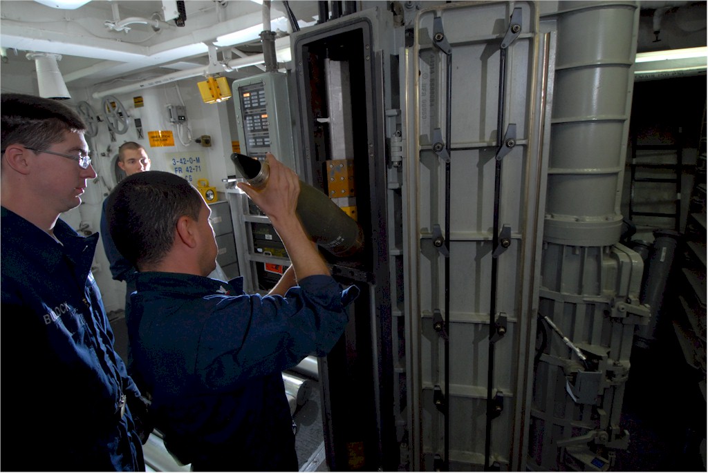 | 153k | Sailors load 70-pound shells into the 5-inch/54-caliber Mk 45 lightweight gun aboard the guided-missile destroyer USS Cole (DDG-67), on 13 October 2009. Cole is participating in Exercise Joint Warrior 09-2, a United Kingdom-led, multinational exercise designed to improve interoperability between allied navies as well as to prepare for a role in combined operations during upcoming deployments. U.S. Navy photo by Mass Communication Specialist 3rd Class Matthew Bookwalter. United States Navy NewsService image # 091013-N-1688B-068. | Robert Hurst |