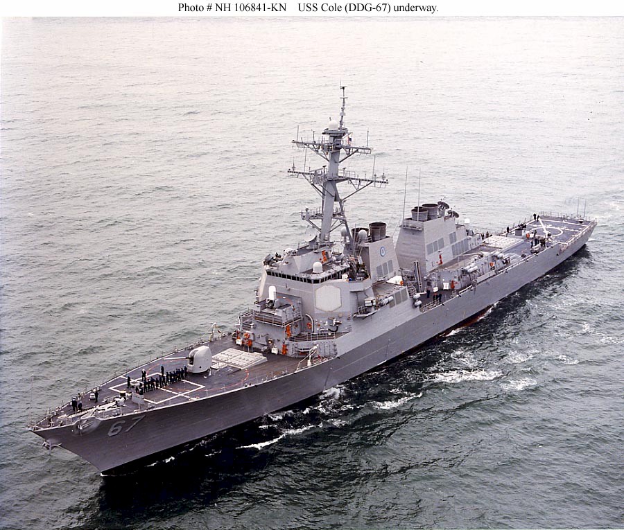 | 73k | Eastern Atlantic, Sep 14 2000, the U.S. Navy Arleigh Burke class guided missile destroyer USS Cole (DDG 67) underway to the Mediterranean Sea, approximately one month before being attacked by a terrorist-suicide mission in the early morning hours of October 12th, 2000, while refueling in the port city of Aden, Yemen, U.S. Navy Photo. | Fabio Peña |
