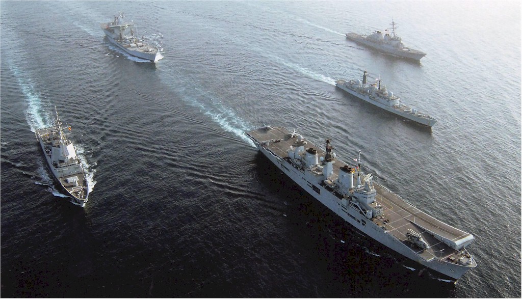 | 188k | The Orion 08 Task Force sailing in close formation in the Mediterranean (left to right): the Spanish frigate SNS Mendez Nunez (F104); the Fleet Replenishment ship RFA Wave Knight; the aircraft carrier HMS Illustrious (R06); the guided missile destroyer HMS Edinburgh (D97) and the guided missile destroyer USS Cole (DDG-67) during a four month (21 Jan - 30 May) out-of-area deployment to the Middle East. Navy News photo. | Robert Hurst |