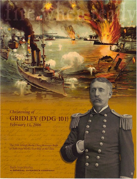 | 17k | Charles Vernon Gridley was born 24 November 1844 in Logansport, Ind., and was appointed to the Naval Academy in 1860. Reporting for duty with his class in September 1863, Gridley joined the sloop-of-war Oneida with the West Gulf Blockading Squadron and distinguished himself with Farragut at the Battle of Mobile Bay 5 August 1864. Promoted to Lieutenant in 1867 and Commander in 1882, he spent the next 30 years at various stations around the world, including a tour as instructor at the Naval Academy. Captain Gridley took command of Olympia, Admiral Dewey's famous flagship, 27 April 1898, a post which he held despite failing health during the Battle of Manila Bay 1 May 1898. It was that morning that Dewey gave his famous command: "You may fire when you are ready, Gridley," immortalizing the doughty captain. After the destruction of the Spanish squadron and the capture of Manila, Gridley was obliged to leave his command because of his health, and died en route to the United States at Kobe, Japan, 25 May 1898. | Steven A. Cardali |