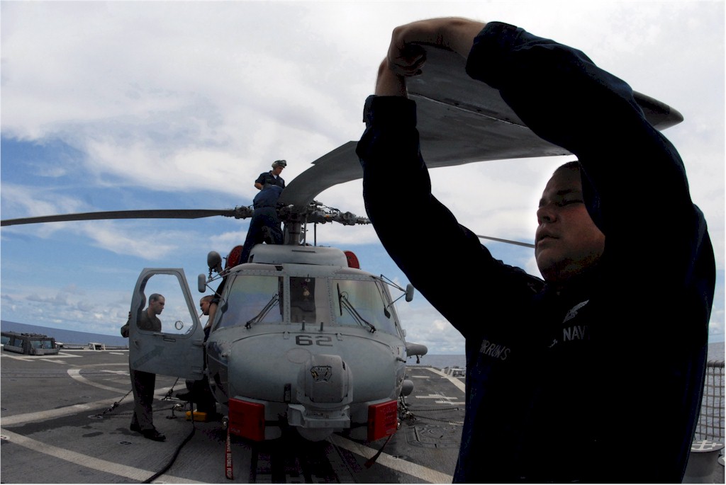 | 112k | 080805-N-4995K-316. Pacific Ocean, August 5 2008, sailors assigned to the "Easy Riders" of Helicopter Anti-submarine Squadron Light (HSL) 37 perform maintenance on an SH-60B helicopter aboard the guided-missile destroyer USS Gridley (DDG 101). Gridley is a assigned to the Ronald Reagan Carrier Strike Group and is on a scheduled deployment in the U.S. 7th Fleet area of responsibility operating in the western Pacific and Indian oceans. U.S. Navy photo by Mass Communication Specialist 3rd Class Chelsea Kennedy. | Robert M. Cieri |