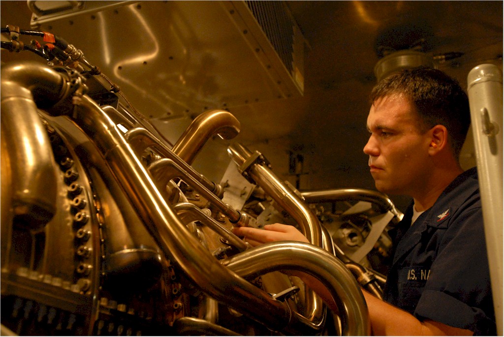 | 181k | 080806-N-4995K-020. Pacific Ocean, August 6 2008, Gas Turbine Systems Technician (Mechanical) 3rd Class Jamie Lawrence performs a preventative maintenance check in the engine room of the Arleigh Burke-class guided-missile destroyer USS Gridley (DDG 101). Gridley is a member of The Ronald Reagan Carrier Strike Group and is on a scheduled deployment in the U.S. 7th Fleet area of responsibility operating in the western Pacific and Indian oceans. (U.S. Navy photo by Mass Communication Specialist 3rd Class Chelsea Kennedy. | Bill Gonyo |