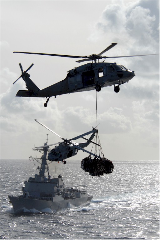 | 95k | 080823-N-1635S-001. Indian Ocean, August 23 2008, the Arleigh Burke class guided-missile destroyer USS Gridley (DDG 101) prepares to pull alongside the Military Sealift Command fast combat support ship USNS Bridge (T-AOE 10) as two MH-60S Sea Hawks assigned to the "Blackjacks" of Helicopter Sea Combat Squadron (HSC) 21 transfer supplies to the Nimitz-class aircraft carrier USS Ronald Reagan (CVN 76) during a vertical replenishment. Bridge and HSC-21 transferred more than 300 pallets of supplies, stores and mail to Ronald Reagan. The Ronald Reagan Carrier Strike Group is on a scheduled deployment in the U.S. 7th Fleet area of responsibility. U.S. Navy photo by Mass Communication Specialist 3rd Class Joshua Scott. | Robert M. Cieri |
