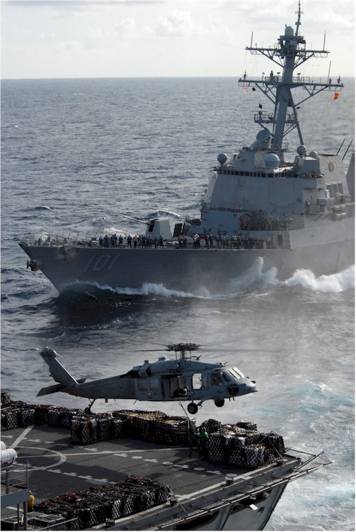 | 116k | 080823-N-1635S-002. Indian Ocean, August 23 2008, the Arleigh Burke class guided-missile destroyer USS Gridley (DDG 101) prepares to pull alongside the Military Sealift Command fast combat support ship USNS Bridge (T-AOE 10) as an MH-60S Sea Hawk assigned to the "Blackjacks" of Helicopter Sea Combat Squadron (HSC) 21 transfers supplies from the Bridge to the Nimitz-class aircraft carrier USS Ronald Reagan (CVN 76) during a vertical replenishment. Bridge and HSC-21 transferred more than 300 pallets of supplies, stores and mail to Ronald Reagan. The Ronald Reagan Carrier Strike Group is on a scheduled deployment in the U.S. 7th Fleet area of responsibility. U.S. Navy photo by Mass Communication Specialist 3rd Class Joshua Scott. | Robert M. Cieri |