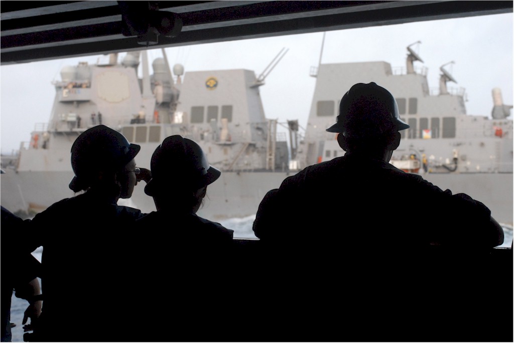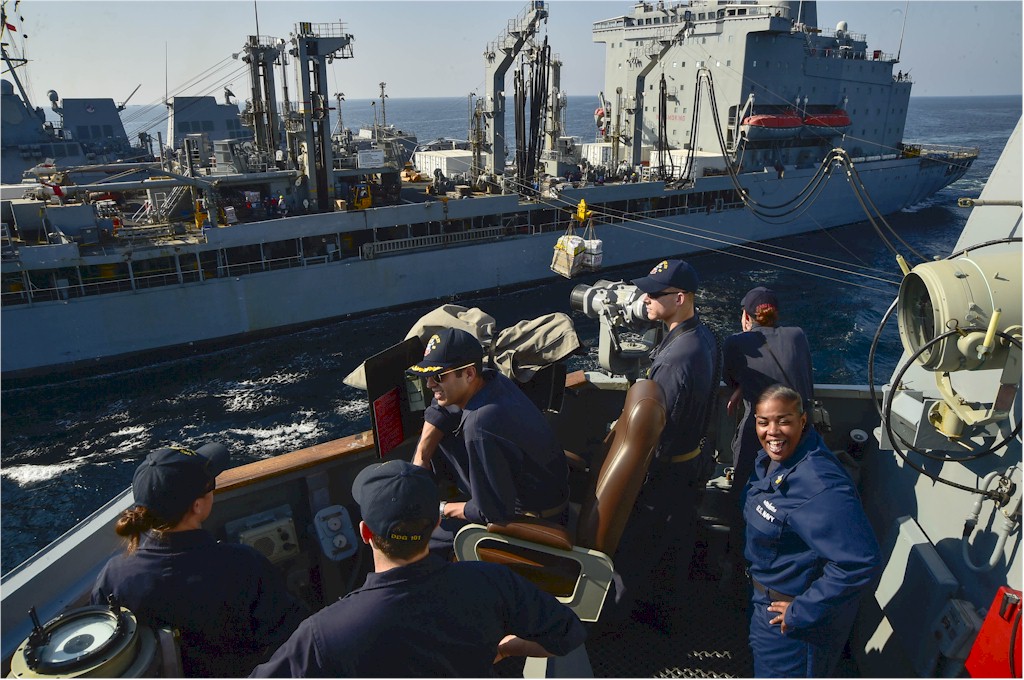 | 215k | 150104-N-DJ750-133. Gulf of Oman, January 4 2015, sailors aboard the guided-missile destroyer USS Gridley (DDG-101) watch from a bridge wing during a replenishment-at-sea with the Military Sealift Command fleet replenishment oiler USNS Walter S. Diehl (T-AO 193). Gridley is deployed in the U.S. 5th Fleet area of responsibility supporting Operation Inherent Resolve, strike operations in Iraq and Syria as directed, maritime security operations, and theater security cooperation efforts in the region. U.S. Navy photo by Mass Communication Specialist 3rd Class Bryan Jackson. | Ron Reeves |