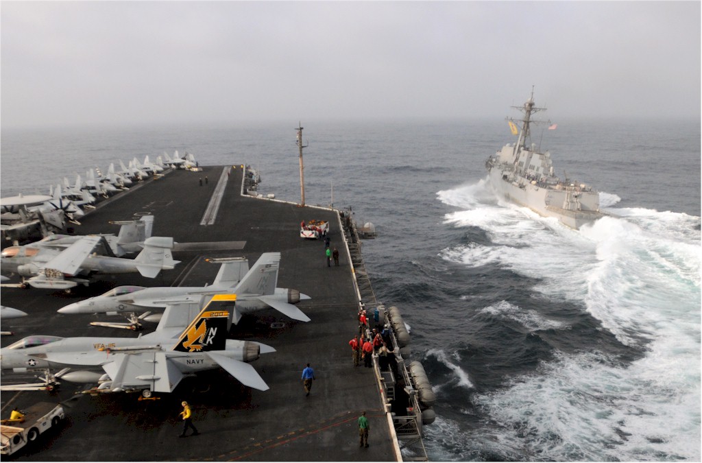 | 162k | 090906-N-4995K-213. Gulf of Oman, September 6 2009, the Arleigh Burke-class guided-missile destroyer USS Gridley (DDG 101) steams alongside the aircraft carrier USS Ronald Reagan (CVN 76) after a fueling at sea (FAS). Ronald Reagan conducts FAS evolutions as a training exercise to help Sailors maintain proficiency. Ronald Reagan is deployed to the U.S. 5th Fleet area of responsibility. U.S. Navy photo by Mass Communication Specialist 3rd Class Chelsea Kennedy. | Robert M. Cieri |