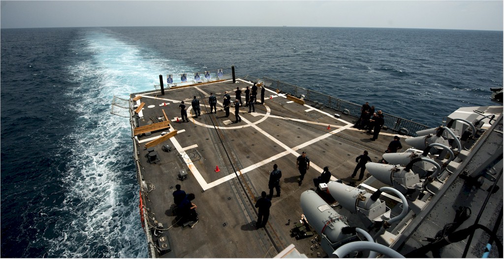 | 186k | 110120-N-TU221-695. South China Sea, January 20 2011, sailors aboard guided-missile destroyer USS Gridley (DDG 101) conduct a weapons qualification course on the flight deck. The course is part of a watch standing qualification requirement. Gridley's on deployment with the Carl Vinson Carrier Strike Group to the US 7th Fleet area of responsibility. US Navy photo by Mass Communication Specialist 3rd Class Travis K. Mendoza. | Robert M. Cieri |