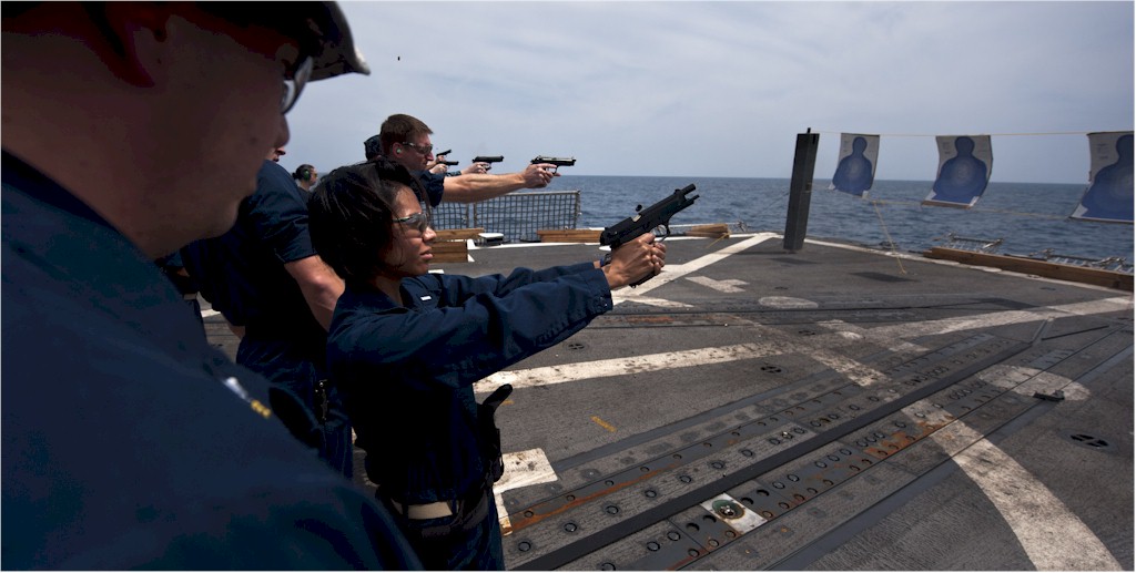 | 111k | 110120-N-TU221-510. South China Sea, January 20 2011, Lt. j.g. Rachel McElvenny, second from left, fires a 9 mm Beretta pistol aboard guided-missile destroyer USS Gridley (DDG 101) as part of a watch standing qualification requirement. Gridley was on deployment with the Carl Vinson Carrier Strike Group to the U.S. 7th Fleet area of responsibility. US Navy photo by Mass Communication Specialist 3rd Class Travis K. Mendoza. | Robert M. Cieri |