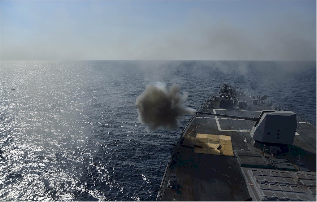| 179k | 141126-N-DJ750-030. Arabian Gulf, November 26 2014, the Arleigh Burke-class guided-missile destroyer USS Gridley (DDG-101) fires its MK 45 5-inch 54/62 caliber lightweight gun during a live-fire exercise. Gridley is deployed in the U.S. 5th Fleet area of operations supporting Operation Inherent Resolve, strike operations in Iraq and Syria as directed, maritime security operations, and theater security cooperation efforts in the region. U.S. Navy photo by Mass Communication Specialist 3rd Class Bryan Jackson. | Ron Reeves |