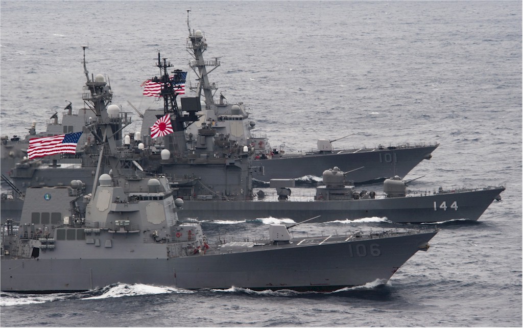 | 184k | 110110-N-7981E-376. Pacific Ocean, January 10 2011, the Japan Maritime Self-Defense Force destroyer JS Kurama (DDH 144), center, takes part in a passing exercise with the guided-missile destroyers USS Gridley (DDG 101), background, and USS Stockdale (DDG 106), foreground. Stockdale and Gridley were under way with the Carl Vinson Carrier Strike Group on deployment to the U.S. 7th Fleet's area of responsibility. US Navy photo by Mass Communication Specialist 2nd Class James R. Evans. | Robert M. Cieri |
