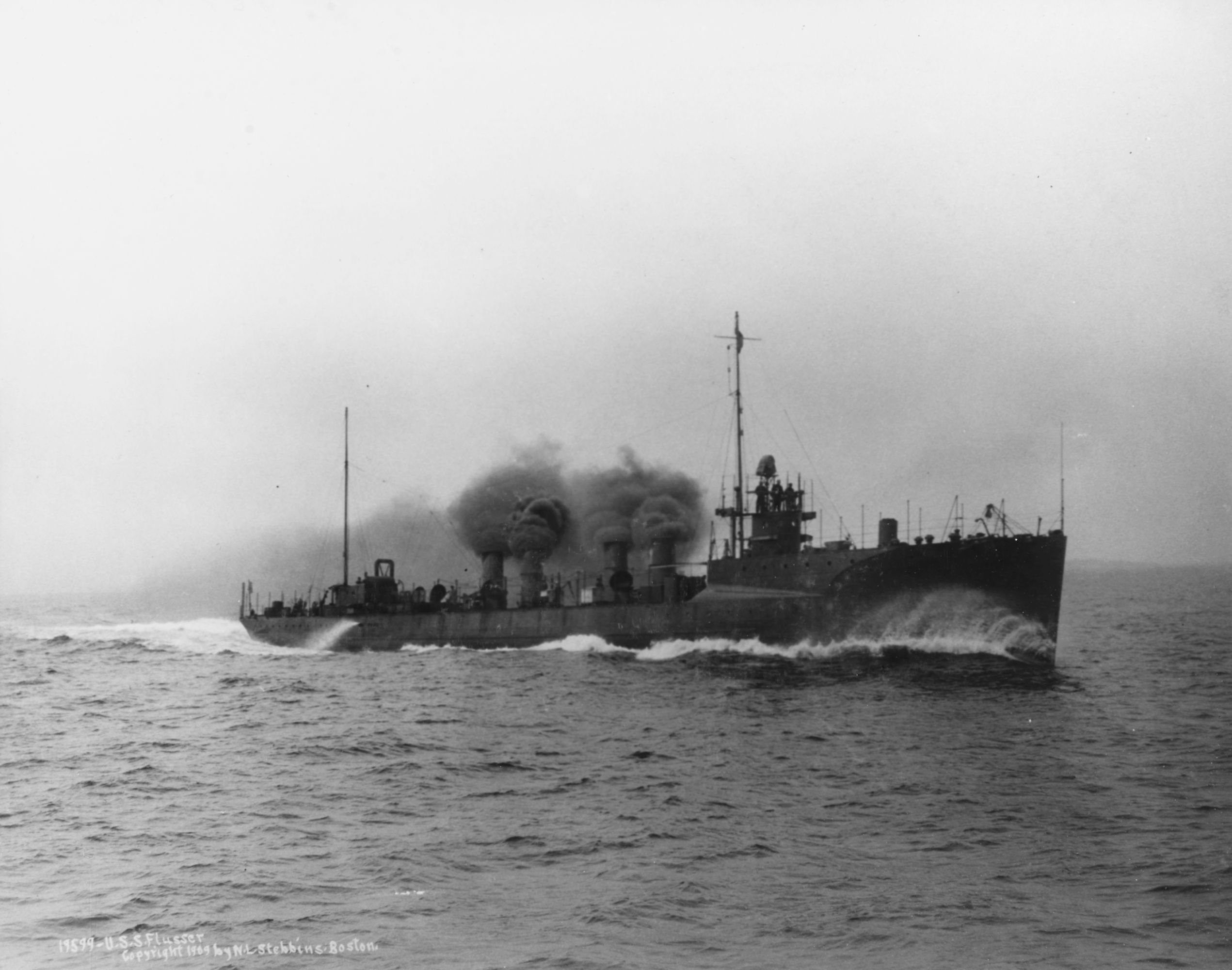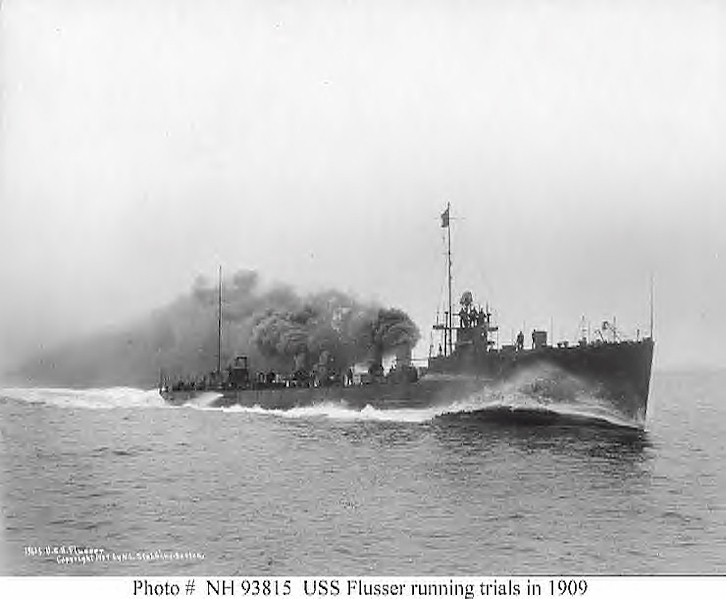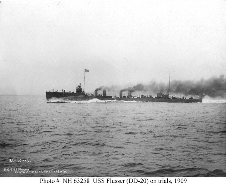 96k | Photo #: NH 63258, USS Flusser (DD-20) running builder's trials shortly before she commissioned, circa September-October 1909. She was constructed by Bath Iron Works, Bath, Maine. Photographed by N.L. Stebbins, Boston. U.S. Naval Historical Center Photograph.