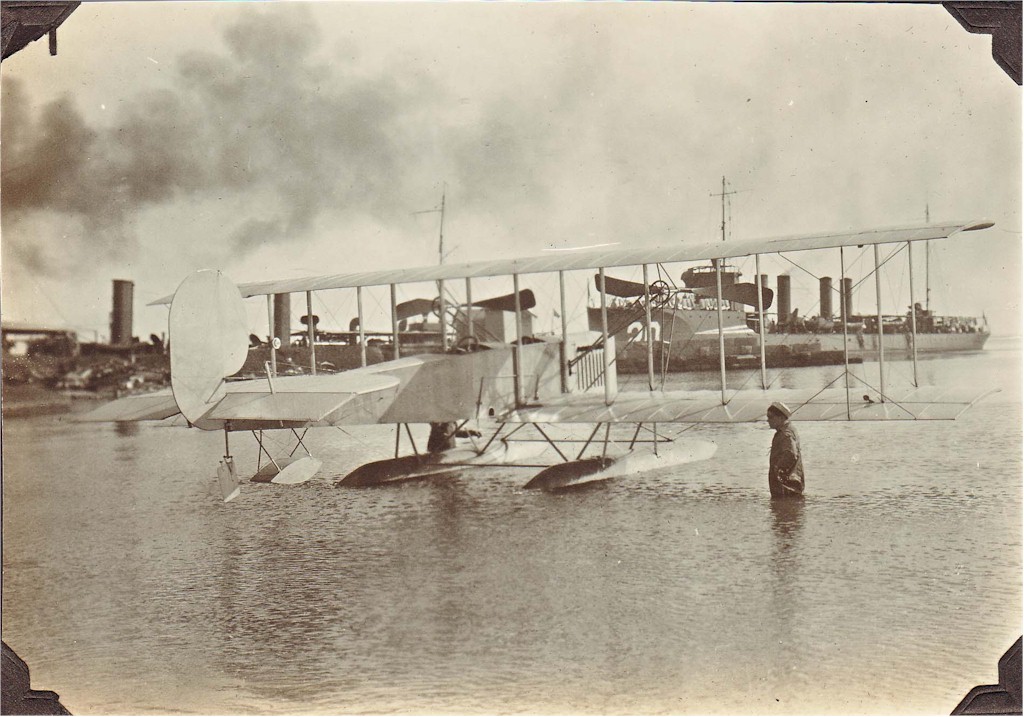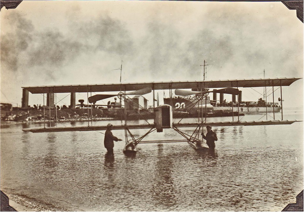 224k | A Wright Model C seaplane is in the water at Naval Aeronautic Station Pensacola, Florida in 1916. The USS Flusser (DD-20) in the background. US Navy and Marine Corps Museum/Naval Aviation Museum, Photo No. 2008.104.001.122. | Mike Green |