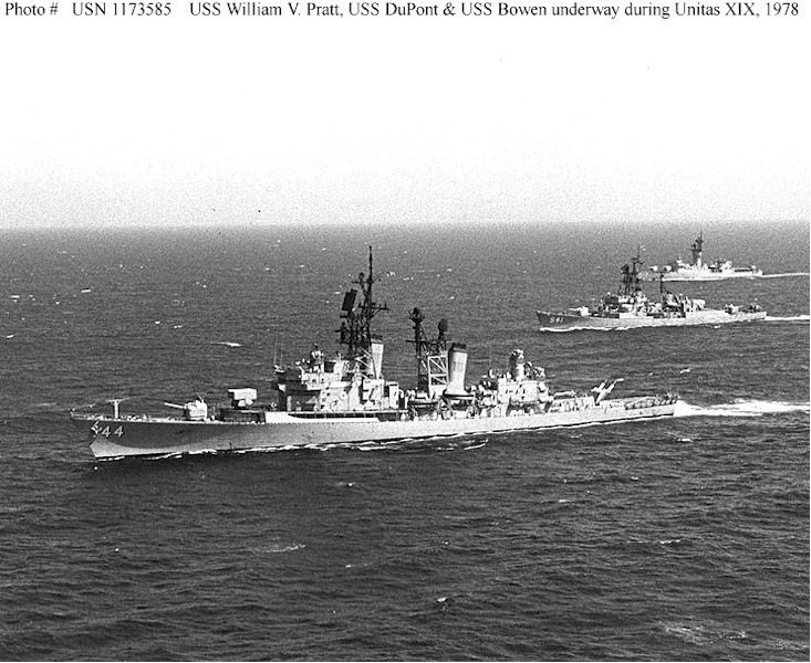 | 139k | Operation "Unitas XIX", September 1978, Ships of Task Group 138 underway in the Atlantic during the operation. They are (from left to right): USS William V. Pratt (DDG-44); USS DuPont (DD-941); and USS Bowen (FF-1079). Official U.S. Navy Photograph. | Fred Weiss |