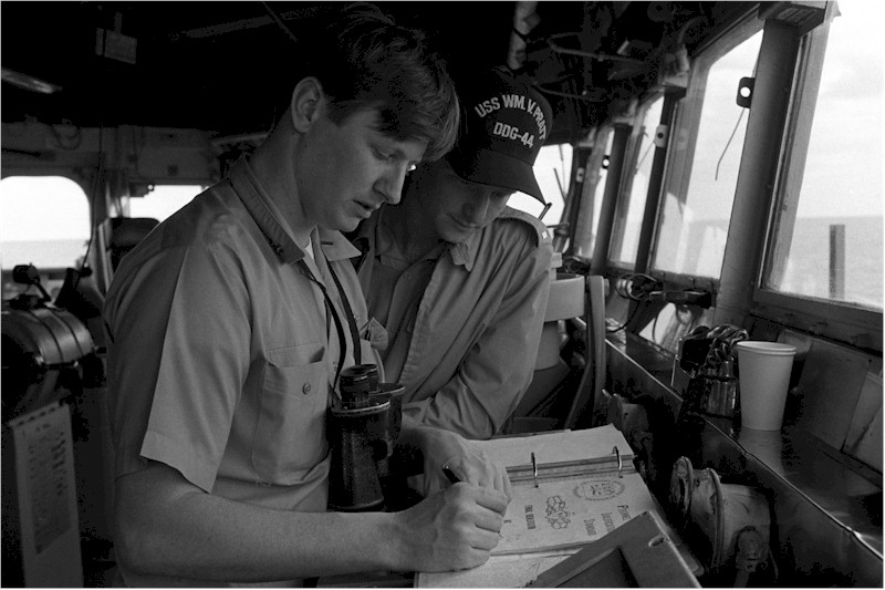 | 100k | DN-SN-87-12734. The Caribbean Sea, a junior officer assists a crew member during a rate test on the bridge of the guided missile destroyer USS WILLIAM V. PRATT (DDG 44). Photo by PH3 Fitzgerald, May 1 1983. | Bill Gonyo |
