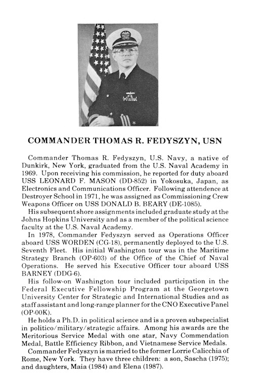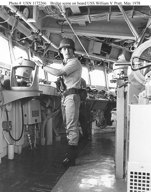 | 119k | Photo #: USN 1172266. Ensign William H. Cheatham stands bridge watch as Officer of the Deck, during a General Quarters drill, 13-26 May 1978. The ship was then taking part in Operation "Solid Shield 1978". Ensign Cheatham also serves as William V. Pratt's Naval Tactical Data System Maintenance Officer. Official U.S. Navy Photograph. | Bill Gonyo |