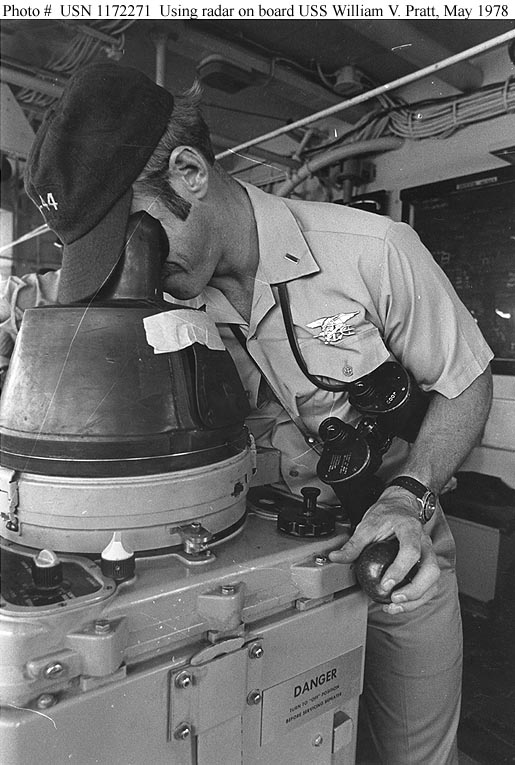 | 90k | Photo #: USN 1172271. Ensign William H. Cheatham, Officer of the Deck, checks the radar scope for surface contacts during his bridge watch, 13-26 May 1978. The ship was then taking part in Operation "Solid Shield 1978". Official U.S. Navy Photograph. | Bill Gonyo |