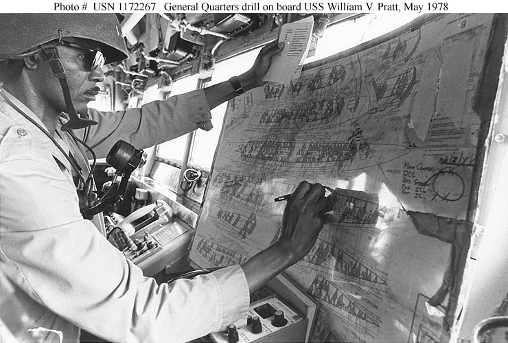 | 101k | Photo #: USN 1172267. Chief Personnelman Julius B. Simmons logs reports of simulated damage on a damage control plan of the ship, during a General Quarters drill, 13-26 May 1978. The ship was then taking part in Operation "Solid Shield 1978". Official U.S. Navy Photograph. | Bill Gonyo |