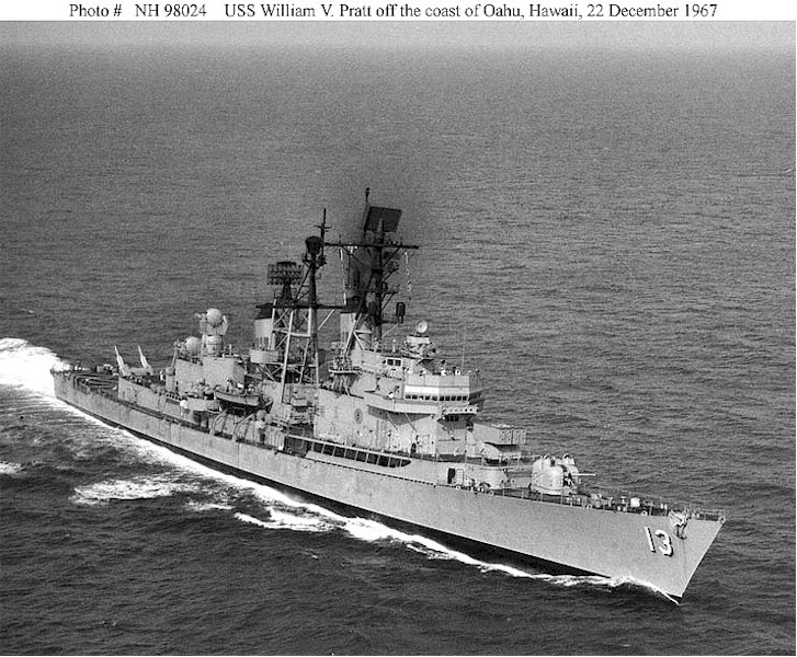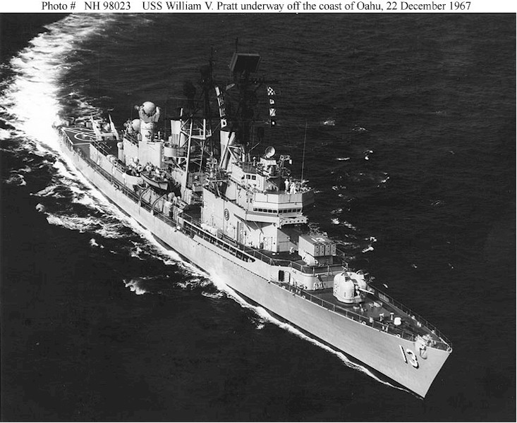 | 162k | USS William V. Pratt (DLG-13) Underway off the coast of Oahu, Hawaii, 22 December 1967. Photographed by Ph3/AC D.R. Hyder. Official U.S. Navy Photograph, from the collections of the Naval Historical Center. | Fred Weiss |