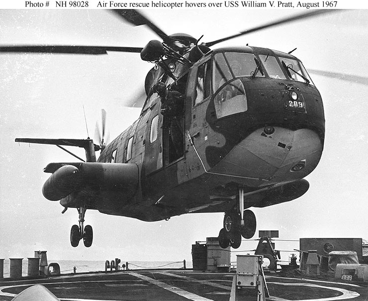 | 101k | Photo #: NH 98028. HH-3 "Jolly Green Giant" U.S. Air Force rescue helicopter hovering over the after deck of USS William V. Pratt (DLG-13) on either 7 or 18 August 1967, while the ship was on Vietnam War duty in the Gulf of Tonkin. U.S. Naval Historical Center Photograph. | Bill Gonyo |