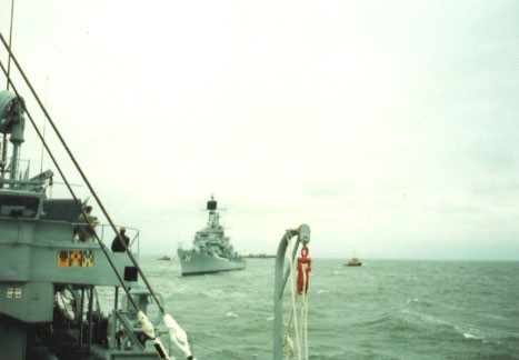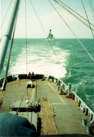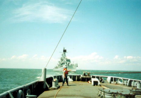 | 29k | Three views of the Guided Missile Destroyer USS William V. Pratt (DDG-44) as seen from the Rescue and Salvage Ship USS Opportune (ARS-41) while under tow from Charleston, S.C. to Philadelphia Naval Shipyard, circa 1991. Photo contributed by Don Knock. | Robert Hurst |