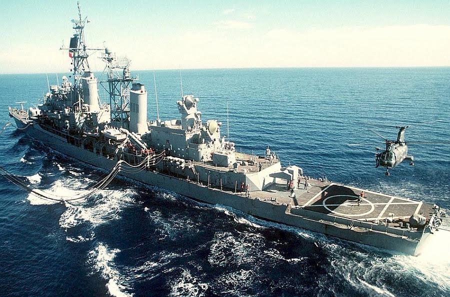 Daniels (CG-27); destroyer USS Conolly (DD-979); frigate USS Truett (FF-1095); and guided missile destroyer USS William V. Pratt (DDG-44). Replenishment oiler USS Kalamazoo (AOR-6) is steaming in the center of the formation.