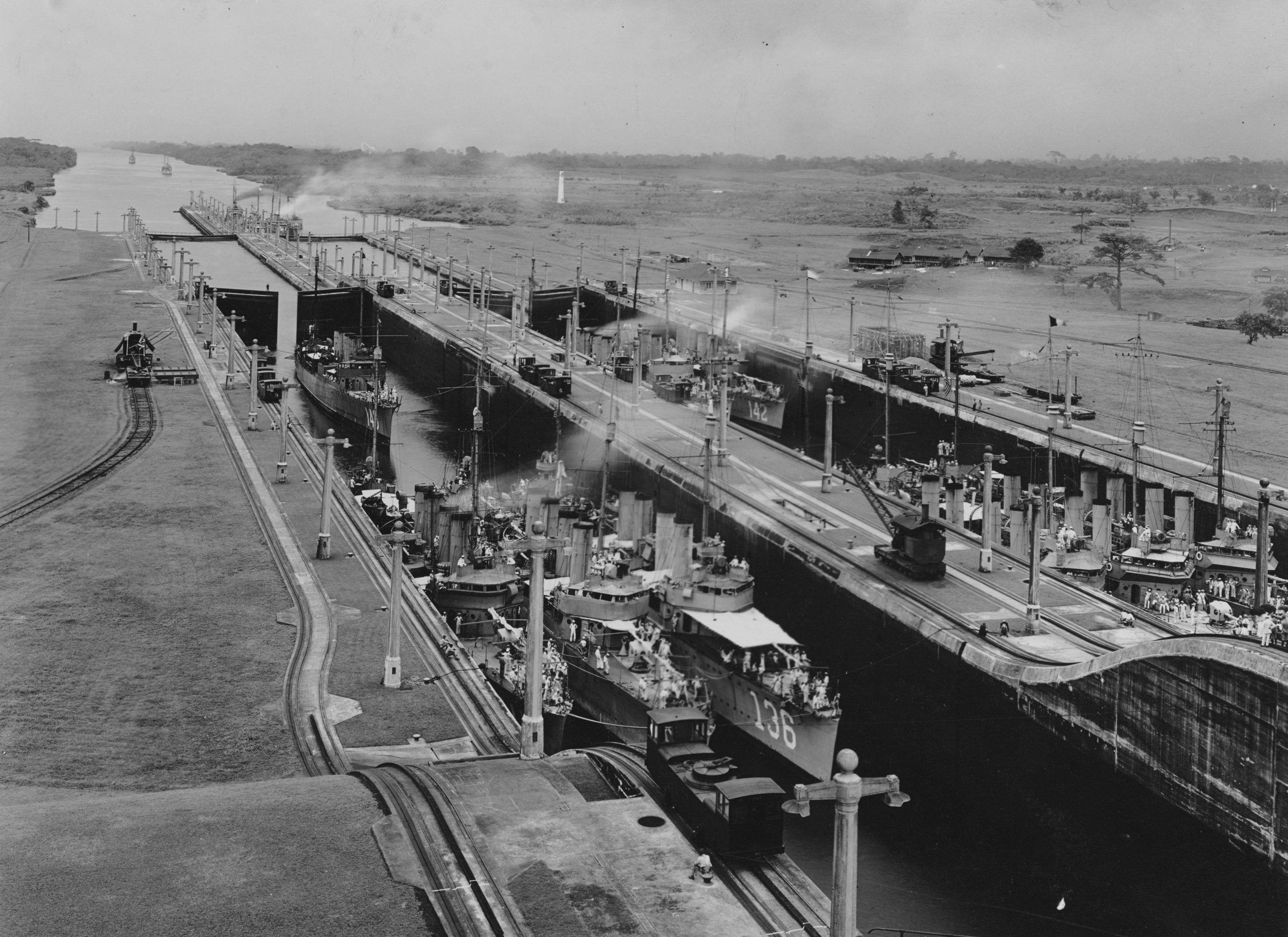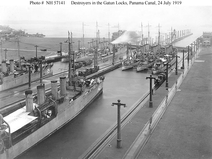 152k | Destroyers in the Middle Chambers, Gatun Lock during the Pacific Fleet's passage through the Panama Canal, 24 July 1919. Those in the front centre are (left to right): USS Waters (Destroyer # 115); USS Dent (Destroyer # 116) and USS Boggs (Destroyer # 136). USS Yarnall (Destroyer # 143) is by herself just aft of that group. Partially visible at right are (left to right): USS Elliot (Destroyer # 146); USS Buchanan (Destroyer # 131) and USS Philip (Destroyer # 76). two of the three ships just astern of that group are: USS Tarbell (Destroyer # 142), right, and USS Wickes (Destroyer # 75, left. Photographed by the Panama Canal Company (their photo # 80-C-5). U.S. Naval Historical Centre photo # NH 42536. | Robert Hurst |