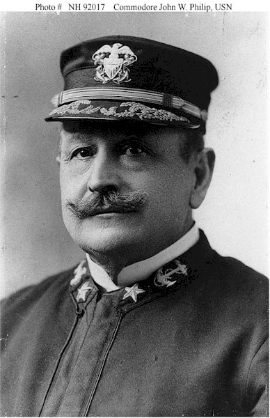 | 77k | John Woodward Philip was born in Kinderhook, Columbia County, New York on 26 August 1840. He was appointed Midshipman 20 September 1856 and graduated from the United States Naval Academy on 1 June 1861. During the Civil War, he served in Santee, Marion and Sonoma until September 1862 when he was ordered to Chippewa, attached to the South Atlantic Blockading Squadron. While serving in Chippewa, he was wounded during operations against Charleston, S.C., July 1863. He commanded Texas from 18 October 1897 to 29 August 1898. During the Spanish-American War, his ship, with Marblehead, led the attack and silenced the fort on Cayo del Toro, Guantanamo Bay on 15 June 1898. On 3 July 1898, in command of Texas, he participated in the Battle of Santiago Bay, in which Cerevera’s Spanish Fleet was destroyed off Santiago de Cuba. He was advanced five numbers in grade on 10 August 1898 for eminent and conspicuous service in battle. From 3 September 1898 until 28 December 1898, he served as Commander 2nd Squadron, North Atlantic Fleet, flying his broad pennant in New York. Commencing 14 January 1899, he was in command of the Navy Yard and Naval Station, New York and was promoted to Rear Admiral 3 March 1899. While serving in this duty, Admiral Philip died suddenly on2030 June 1900. Photo #: NH 92017. Commodore John W. Philip, USN photograph taken circa 1898-1899. Donation of Mrs. Mary F. Philip, 1969. U.S. Naval Historical Center Photograph. | Tony Cowart/Robert M. Cieri |