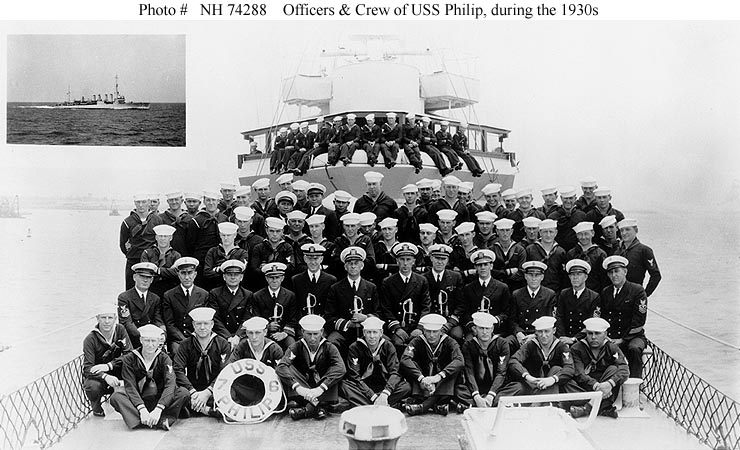 | 94k | Photo #: NH 74288, USS Philip (DD-76) ship's officers and crew, posed on her foredeck during the 1930s. A small photograph of the ship is inset in the upper left. Courtesy of the Naval Historical Foundation, 1971. U.S. Naval Historical Center Photograph. | Paul Rebold |