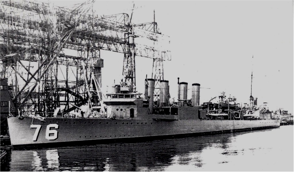 (left to right, in the middle diagonal row): Wickes (DD-75); Thornton (DD-270); Meade (DD-274); Crane (DD-109); Evans (DD-78); McCawley (DD-276); Doyen (DD-280); Elliot (DD-146); Henshaw (DD-278); Moody (DD-277); Meyer (DD-279); Sinclair (DD-275); Turner (DD-259); Philip (DD-76); Hamilton (DD-141); Boggs (DD-136); Claxton (DD-140); Ward (DD-139); Hazelwood (DD-107) or Kilty (DD-137); Kennison (DD-138); Jacob Jones (DD-130); Aulick (DD-258); Babbitt (DD-128); Twiggs (DD-127); and Badger (DD-126).