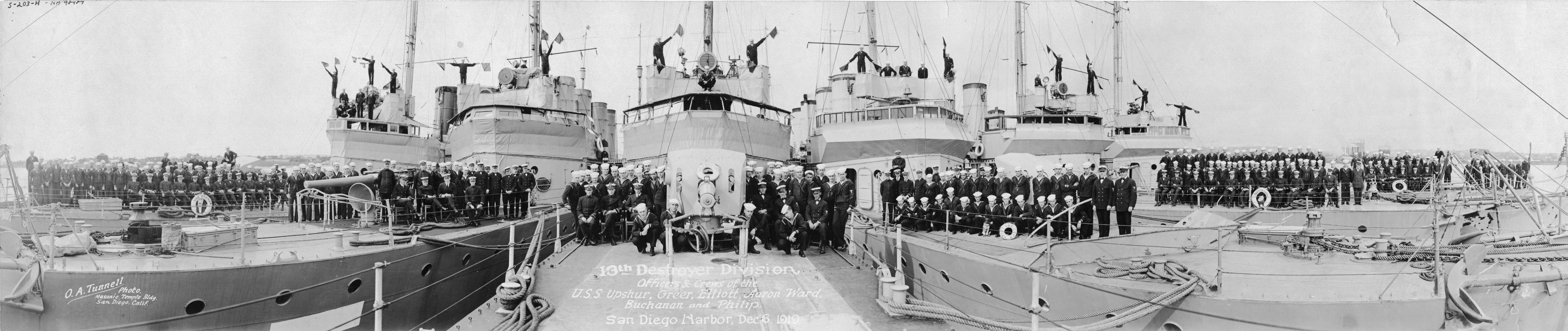 108k | Thirteenth Destroyer Division Officers & Crews on board their ships in San Diego Harbor, California, 6 December 1919. Signalmen are sending semaphore messages from atop the ships' bridges. Panoramic photograph by O.A. Tunnell, Masonic Temple Building, San Diego. Ships present are (from left to right): Upshur (Destroyer # 144), Greer (Destroyer # 145), Elliot (Destroyer # 146), Aaron Ward (Destroyer # 132), Buchanan (Destroyer # 131) and Philip (Destroyer # 76). Donation of Captain W.D. Puleston, USN (Retired), 1965. U.S. Naval Historical Center Photograph. | Fred Weiss |