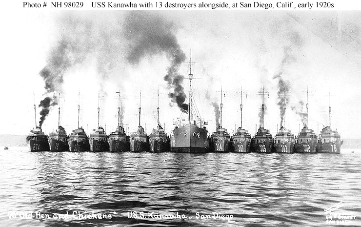 | 108k | "Old Hen and Chickens" USS Kanawha (AO-1) with thirteen destroyers alongside, off San Diego, California, during the early 1920s. Photographed by Bunnell, 414 E Street, San Diego. Ships present are (from left to right): USS Meade (DD-274); USS Evans (DD-78); USS Kennedy (DD-306); USS Aaron Ward (DD-132); USS Woolsey (DD-77);