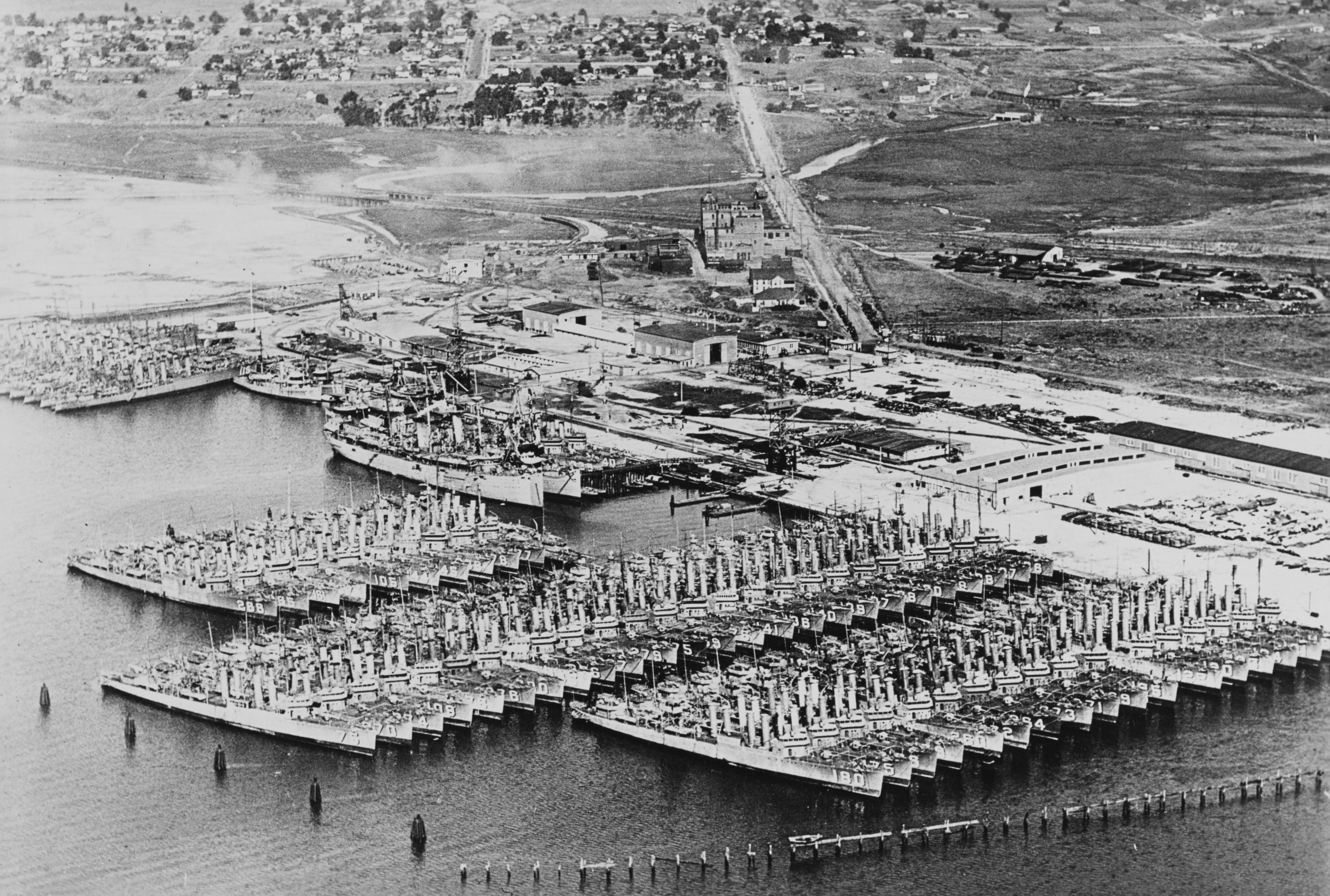 195k | Red Lead Row, San Diego Destroyer Base, California. Photographed at the end of 1922, with at least 65 destroyers tied up there. Ships present are identified as: