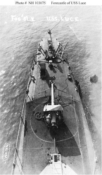 66k | Photo #: NH 103075, USS Luce (Destroyer # 99) view of the ship's forecastle, seen from her foremast, probably circa Fall 1918, soon after she was placed in commission. Note her forward 4"/50 gun and anchor handling gear. Photographed by Walton. The original image is printed on postal card ("AZO") stock. Donation of Dr. Mark Kulikowski, 2005. U.S. Naval Historical Center Photograph. | Tony Cowart |