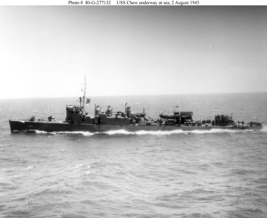 | 87k | USS Chew (DD-106), Underway at sea in the eastern Pacific area, 2 August 1945. Note the late World War II configuration of this old destroyer: aftermost of her original four smokestacks removed, with the remaining three shortened; retention of midships torpedo tubes and original four 4"/50 guns, with one gun still mounted on her main deck aft; and "K-Gun" depth charge throwers in place of her after torpedo tubes. Chew's paint scheme is somewhat reminiscent of the 1941 vintage Camouflage Measure One, with dark paint except on her smokestack tops and (apparently) her upper upper foremast. Official U.S. Navy Photograph, now in the collections of the National Archives. Photo #: 80-G-277132. | Robert Hurst |